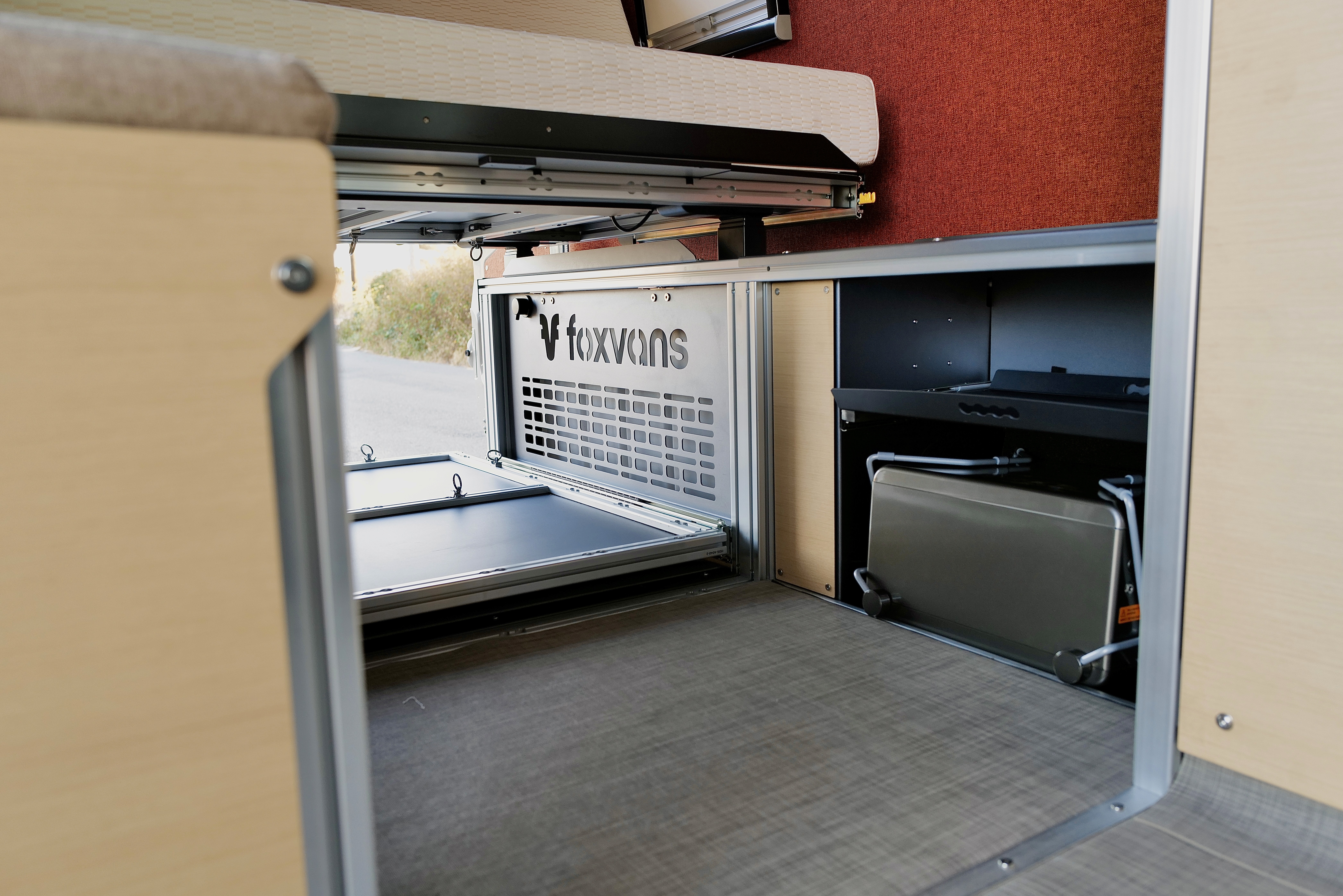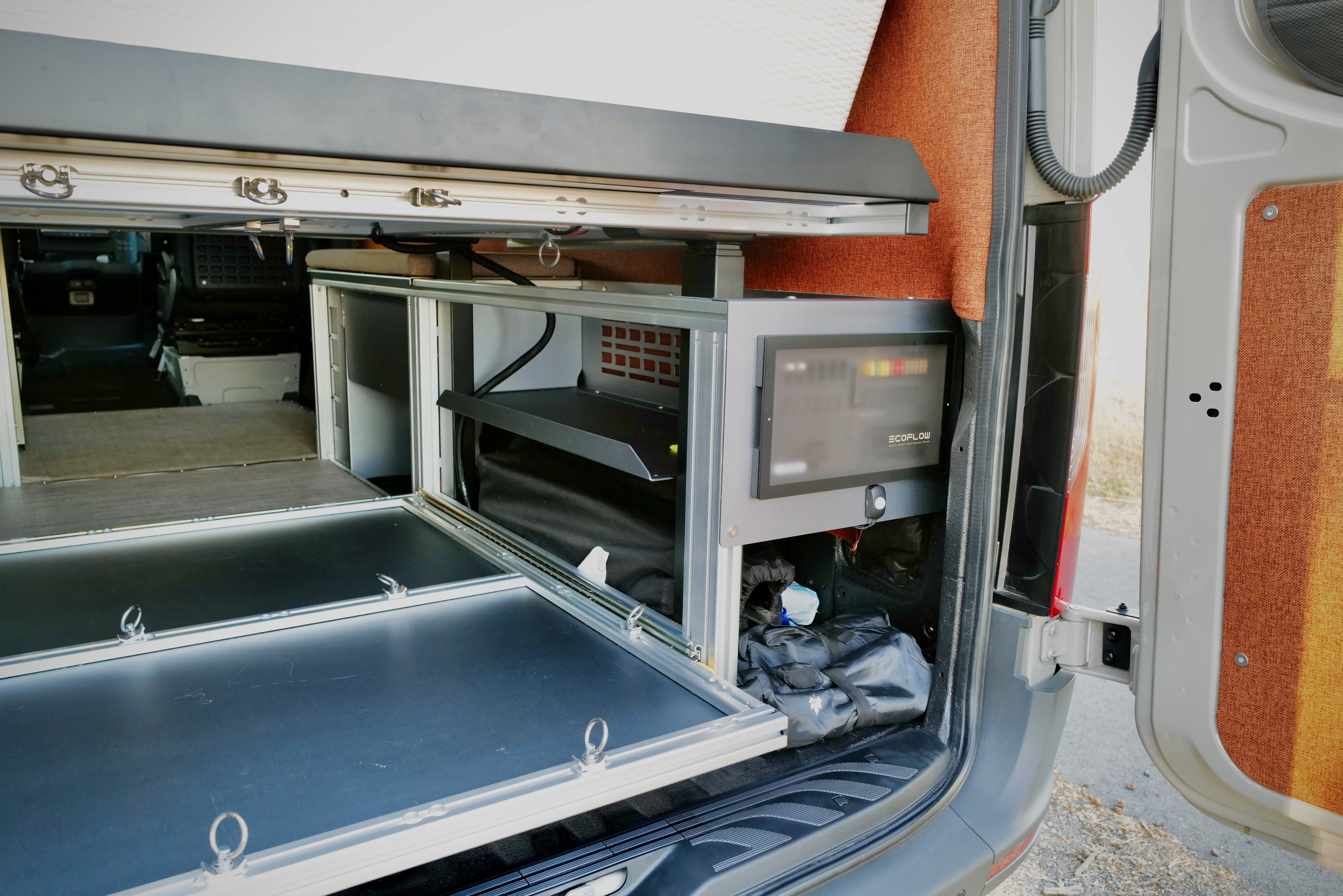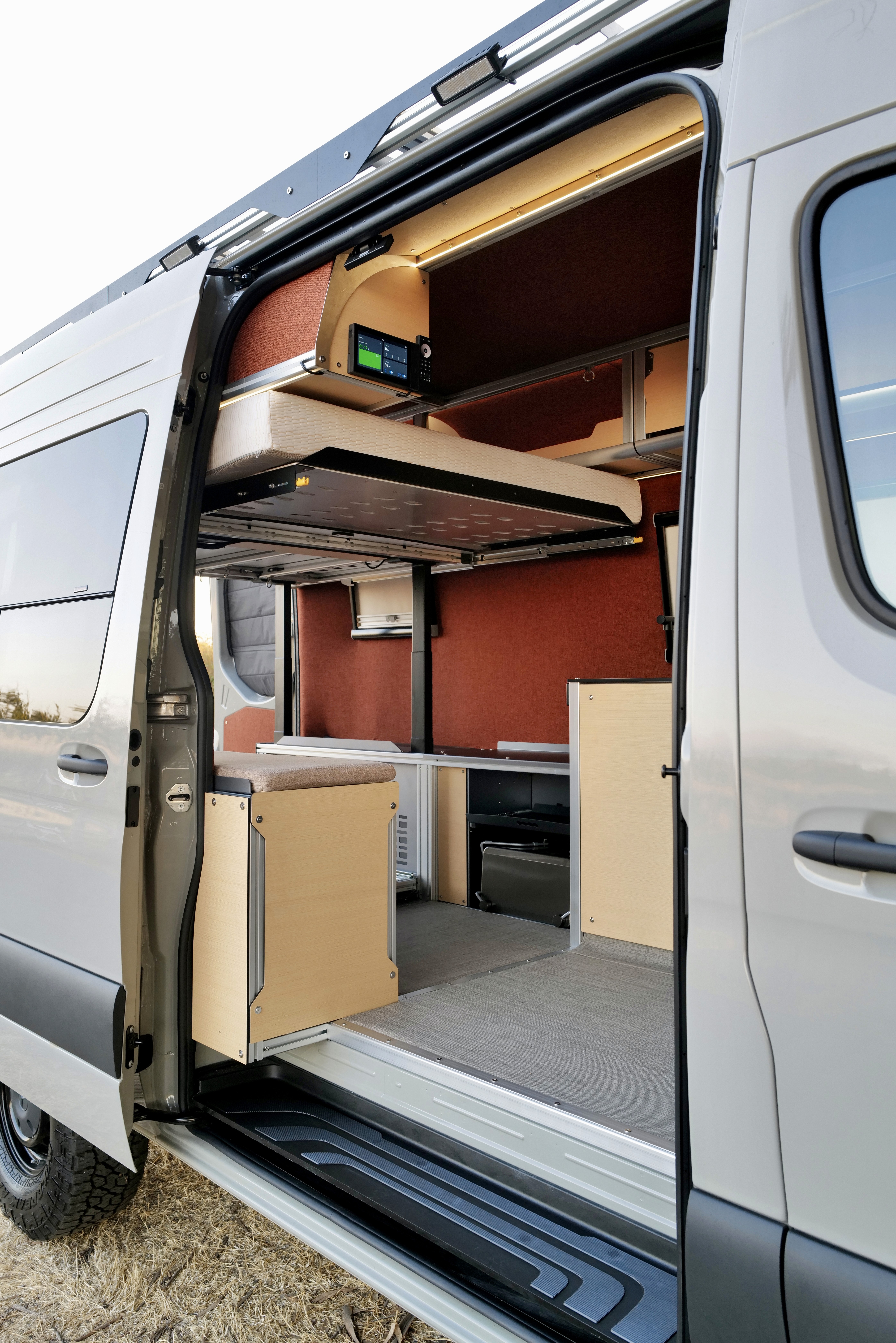 Bed lifts to open a huge rear garage for bikes, recovery gear, and storage bins