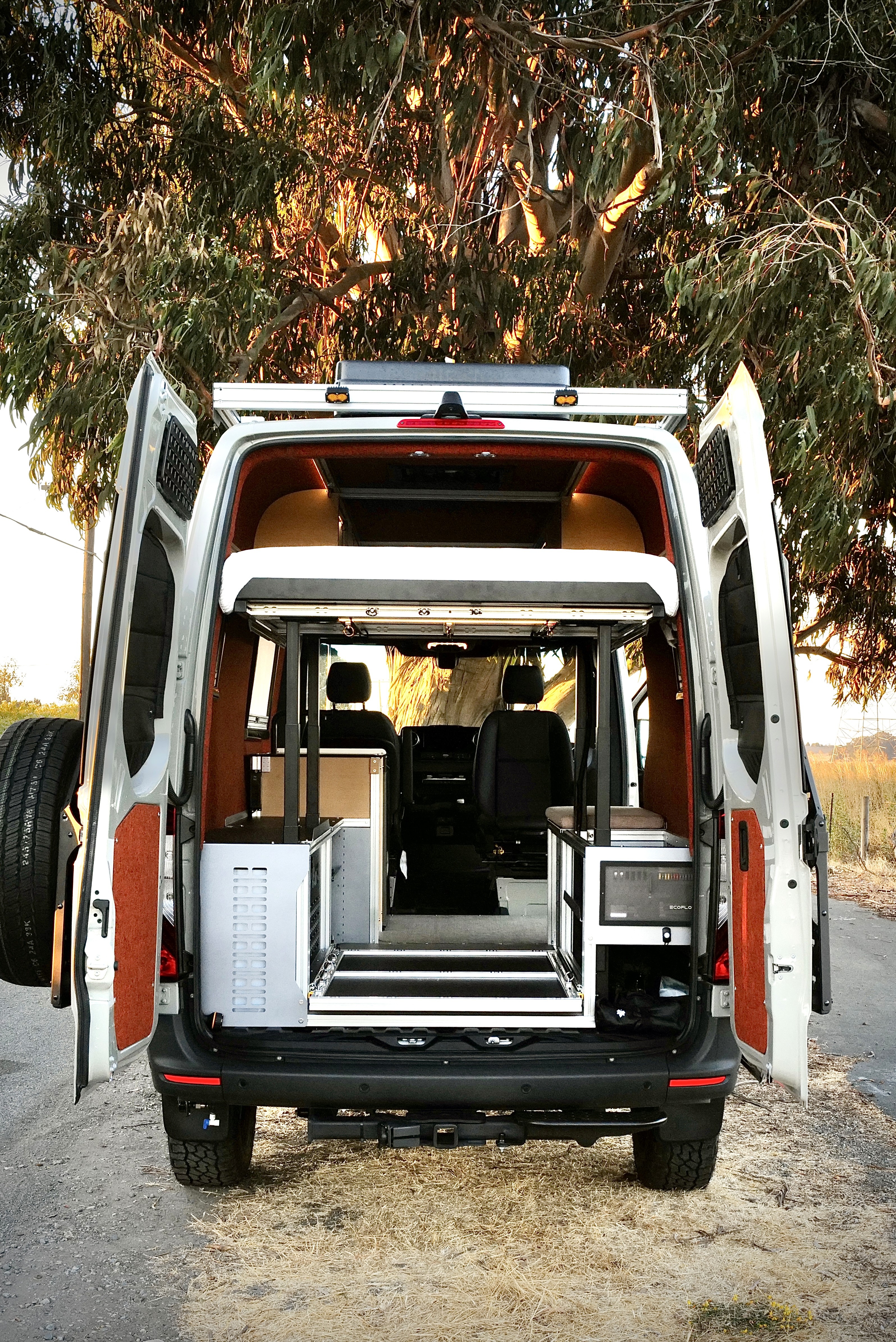 Roof rack, all-terrain tires, and modular aluminum cabinetry, ready for solar, extra fuel, and water upgrades