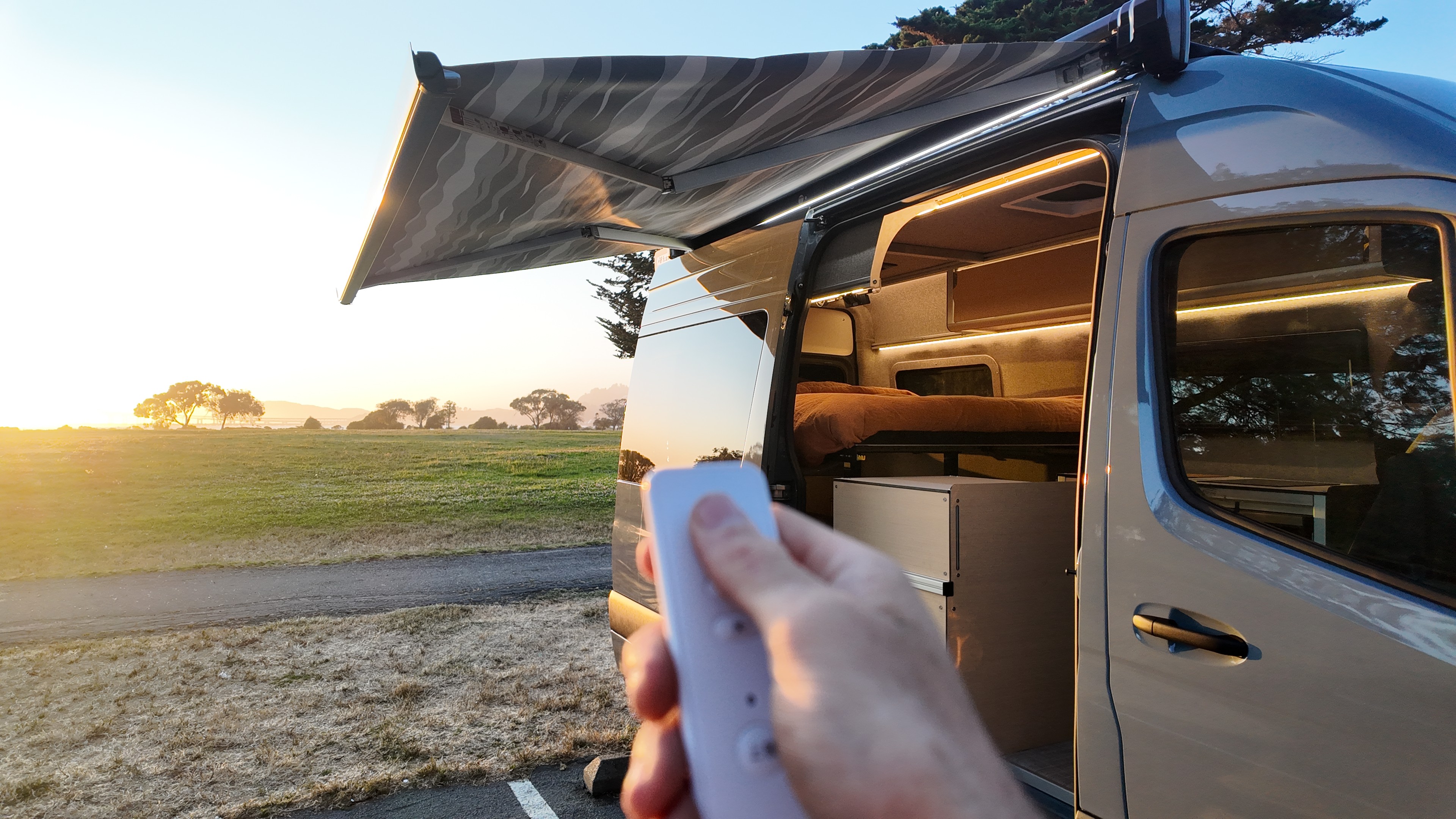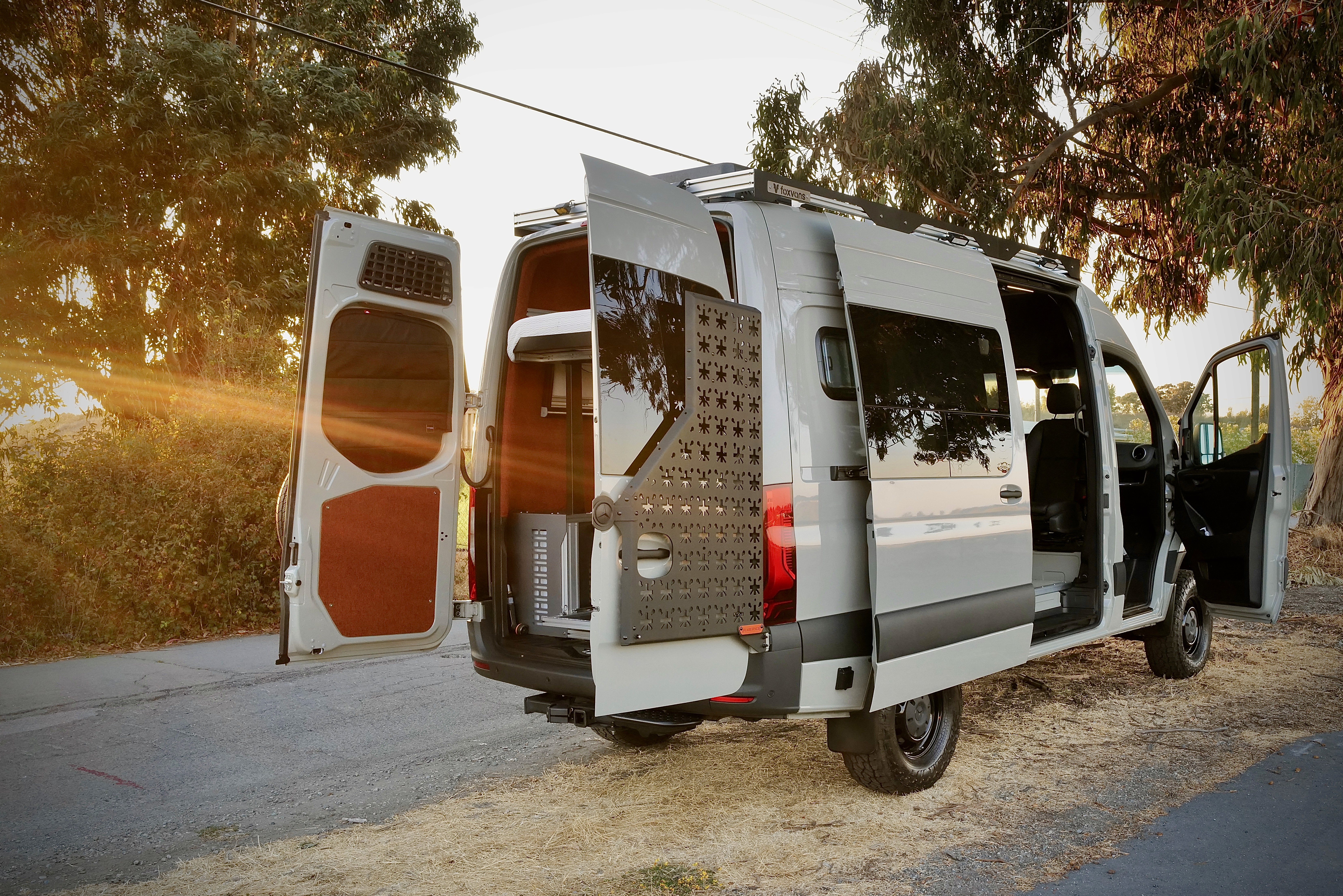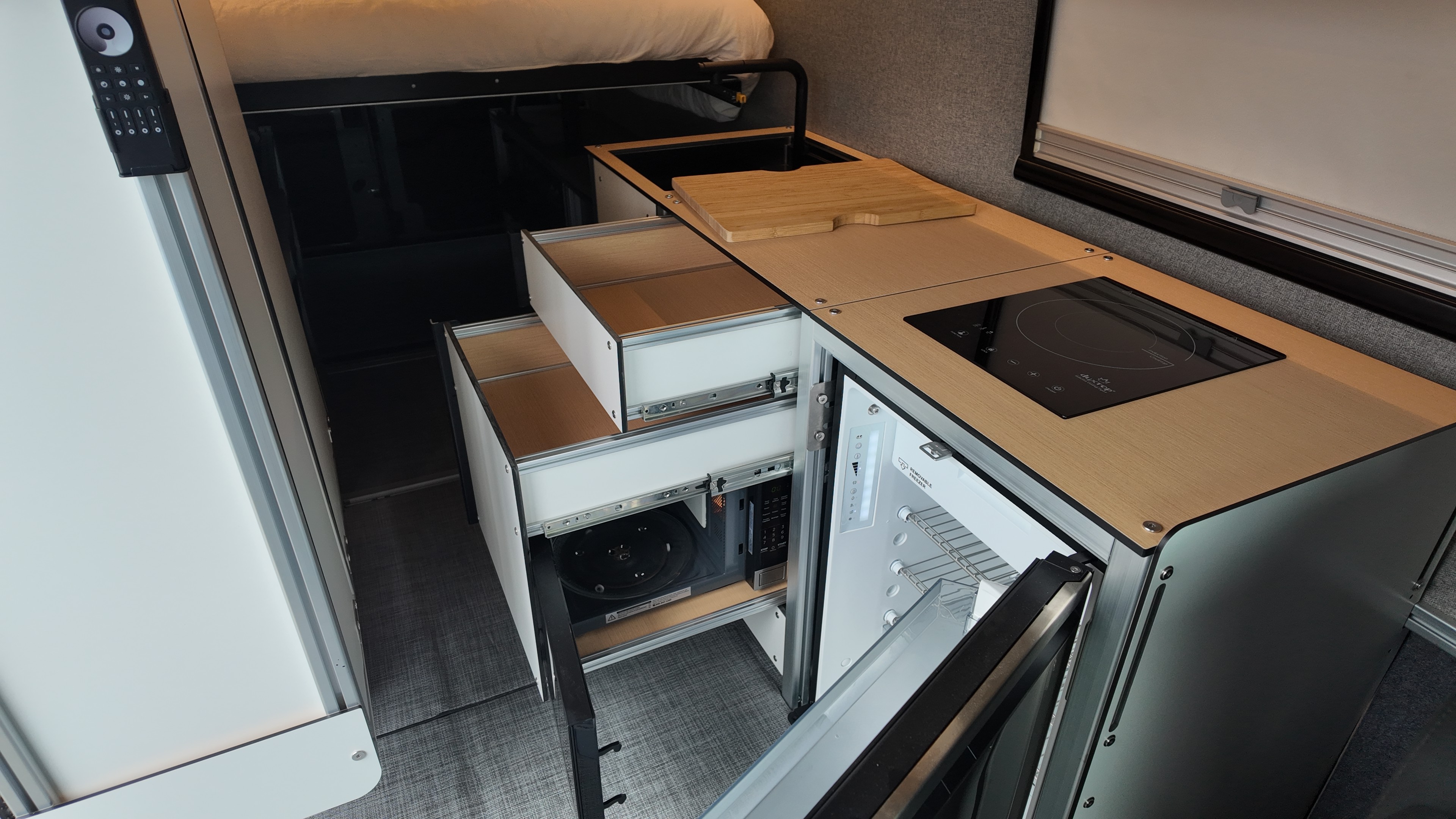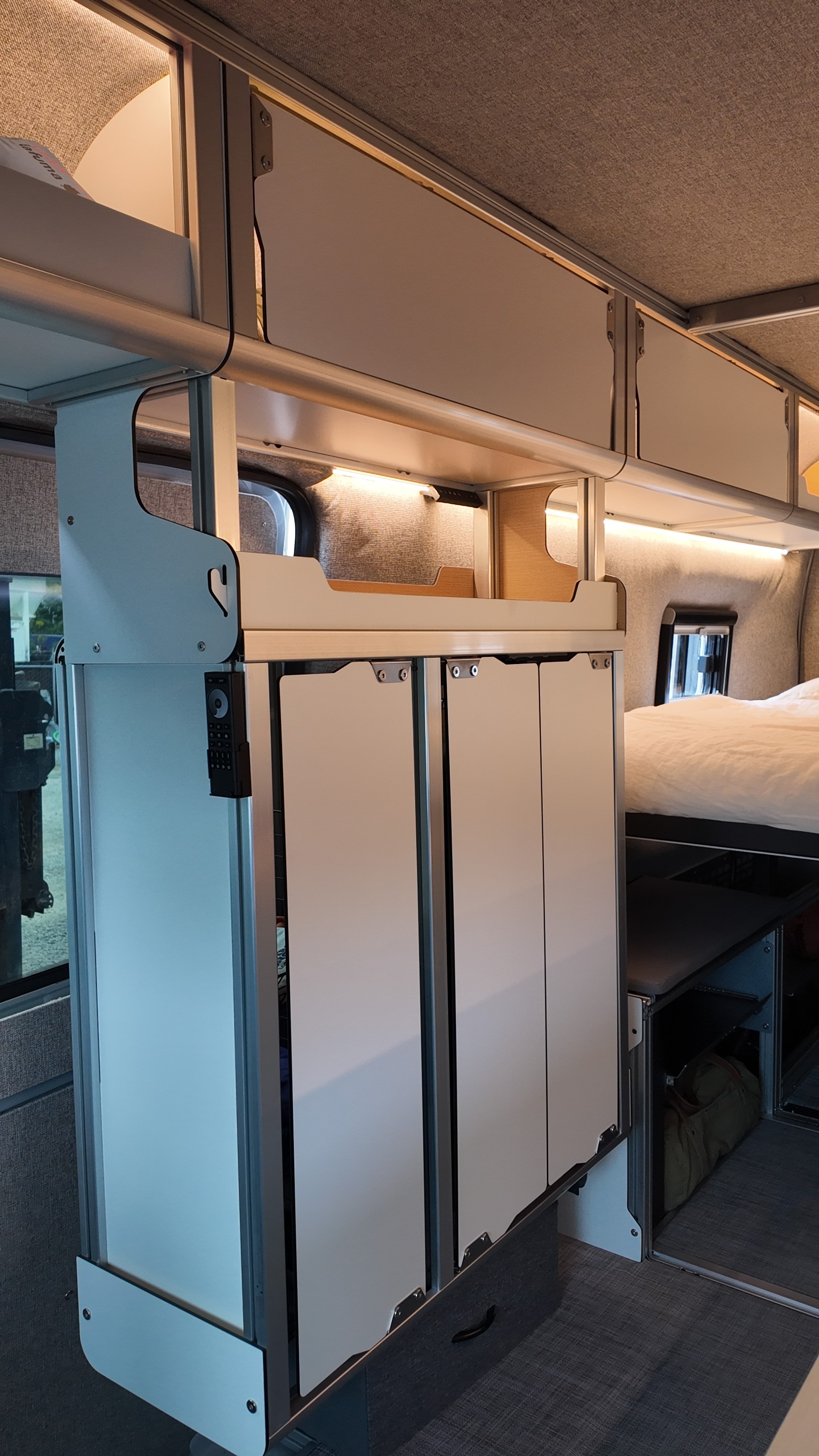 High-roof van converted into a bright, modern two-person cabin featuring our Super Sleeper queen bed, full-length aluminum cabinets, and a compact galley for extended trips.