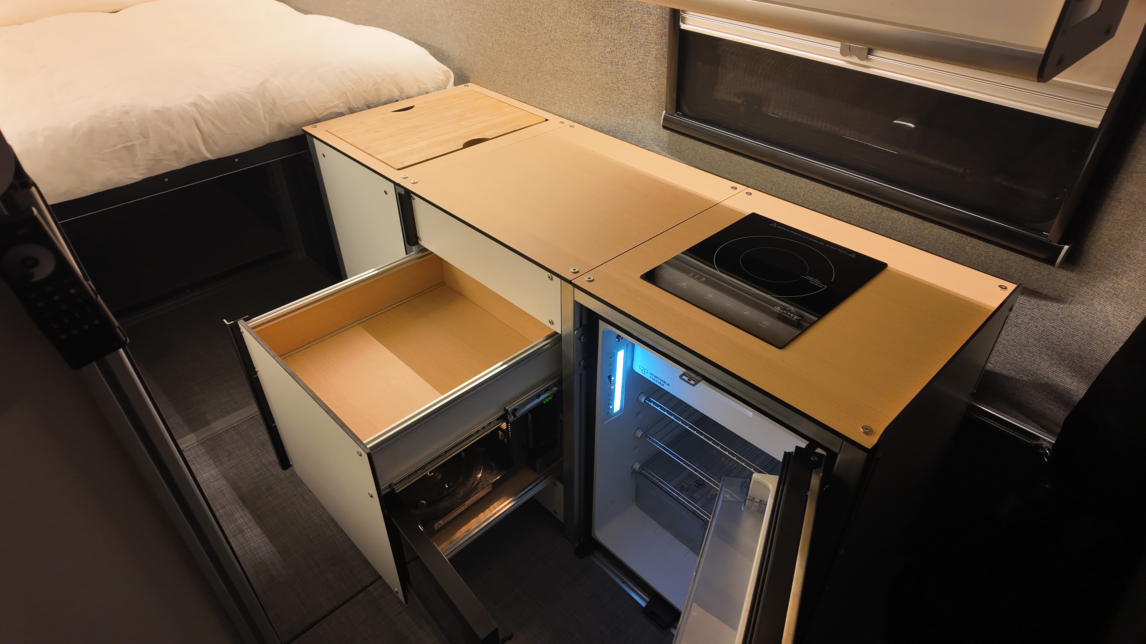 Compact galley with sink, bamboo cover, induction-ready counter, and fridge