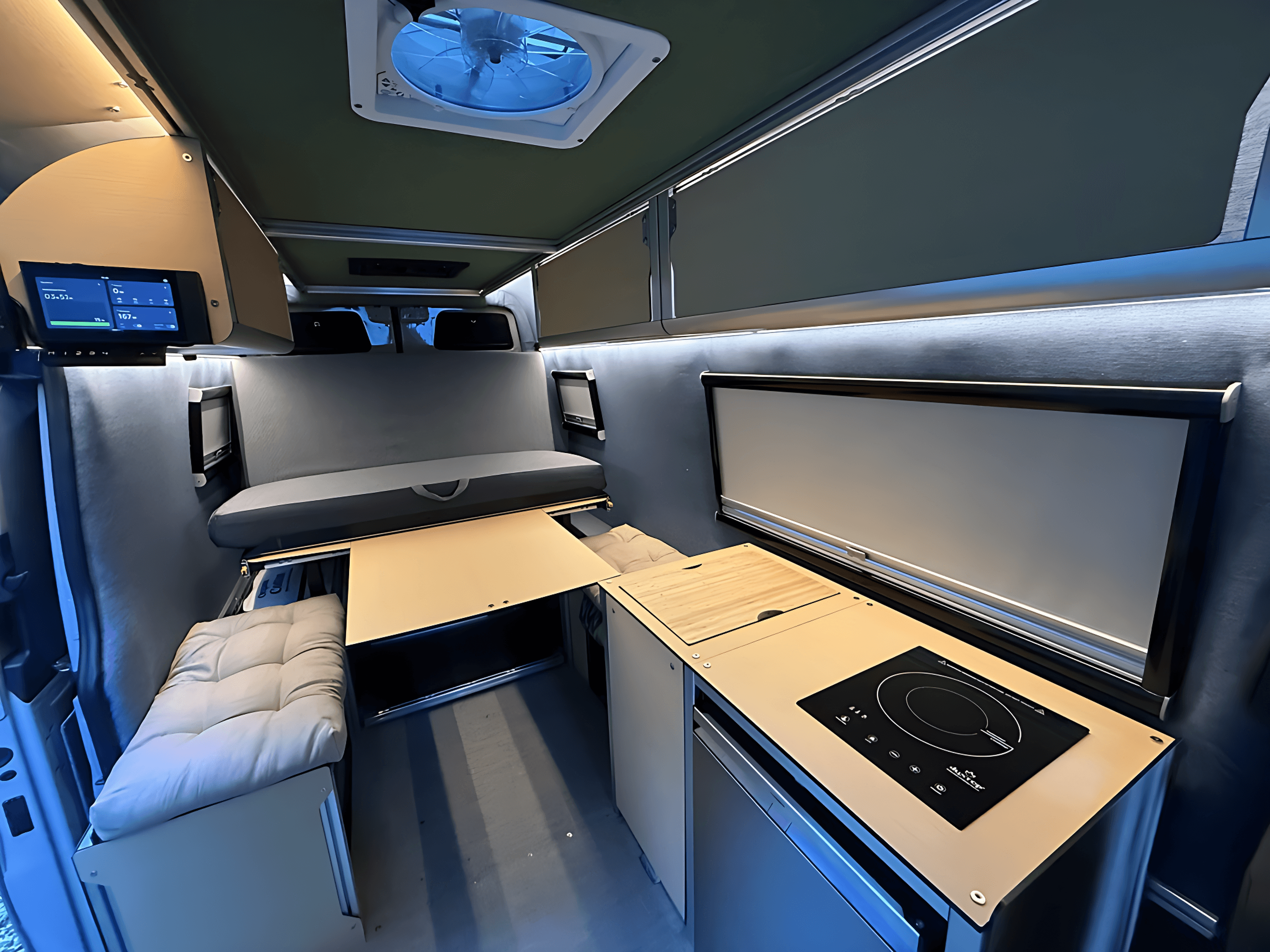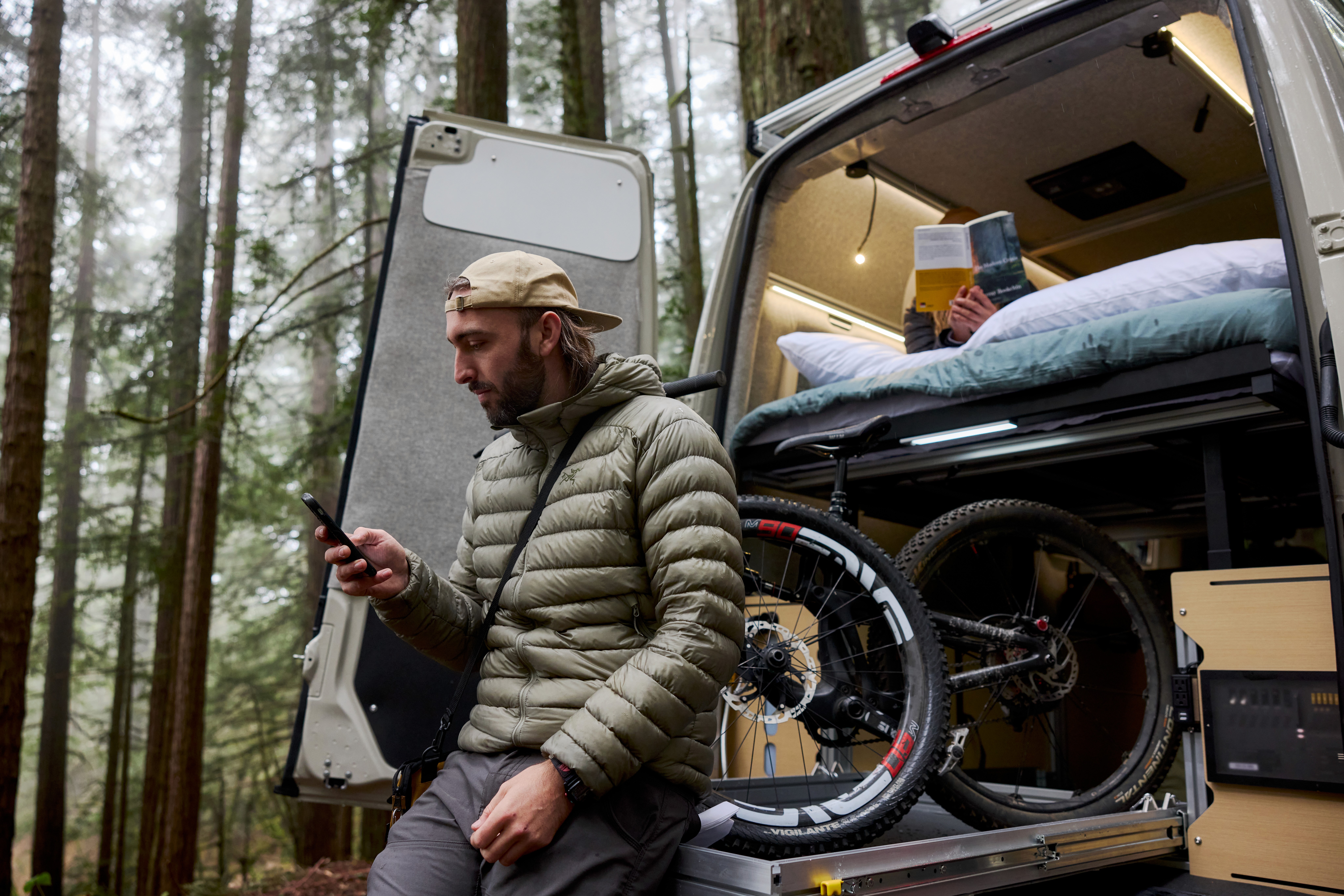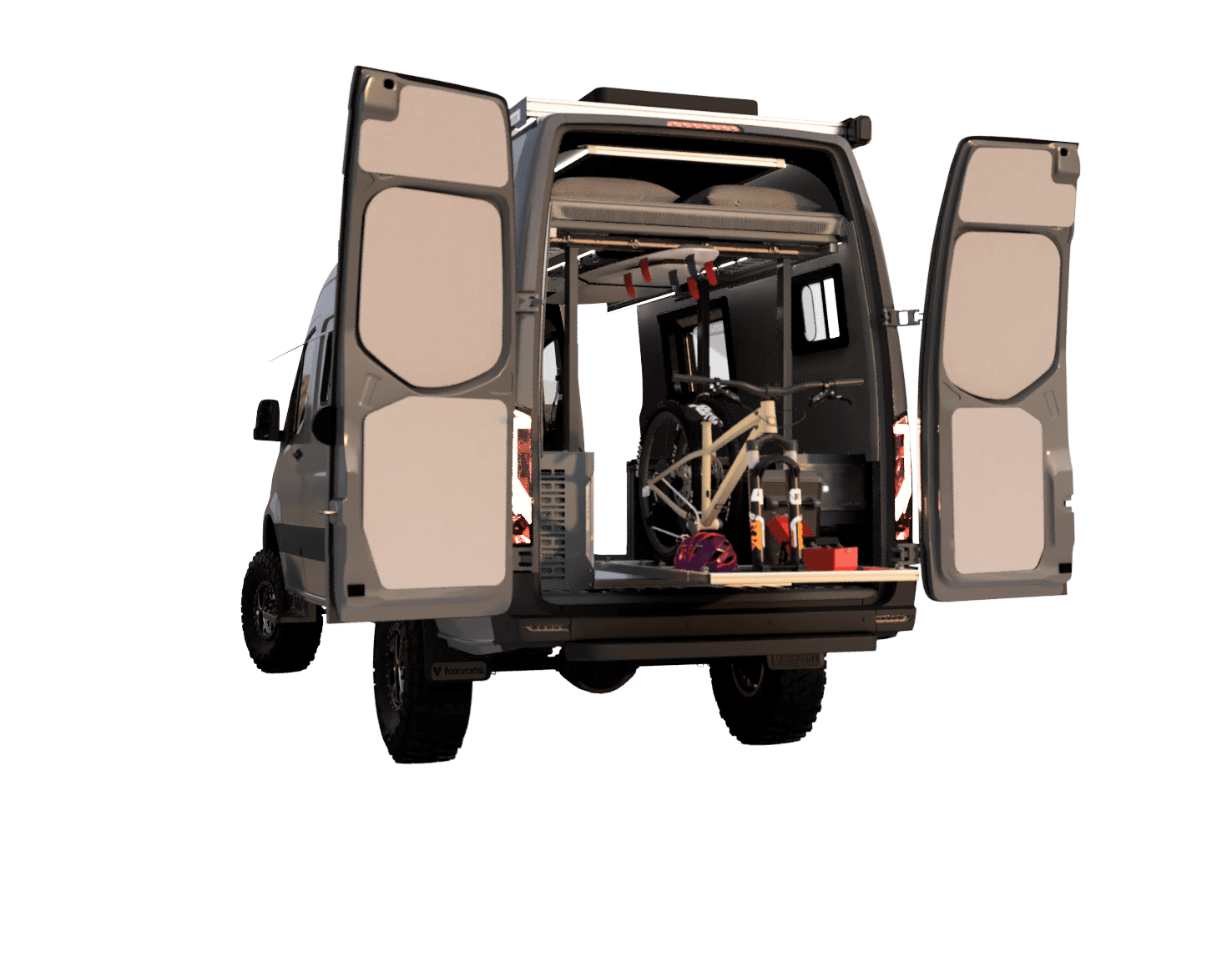 We are so happy we crossed paths with Andrew & Michael at the Adventure Van Expo in Lake Tahoe last year. We had been looking for the last 3 years. We were also debating between the Sprinter 144 & 177. Foxvans was the van build we had been looking for. Their bed system is genius; it allowed us to get a 144 with the feeling of inside space of a 177. The any elevation of the bed adds super flexibility for garage storage. The bed also folds into a couch which also gives you a dining/desk/prep area. Other things that they figured out for us: The spare tire stayed in the factory location, which was huge for us and our bike rack. We have 35 gallons of fresh water, 6 gallons of hot water, with an 11-gallon grey water tank under-mounted. Our hot water heats via engine block or electric heating. Our build is super light and no upgrade to custom suspension or shocks was necessary. We’re happy campers and can’t recommend Foxvans enough.